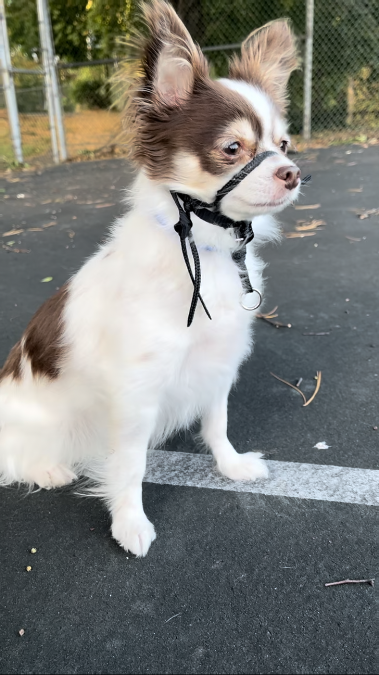 Harper is wearing training equipment designed to gently control and limit her fear and arousal in different contexts. Through positive conditioning, she has made positive associations, which have reduced her fear of triggers and lowered her motivation for defensive behavior. With such a huge change in behavior in such a short period of time, there’s no telling what she will accomplish.